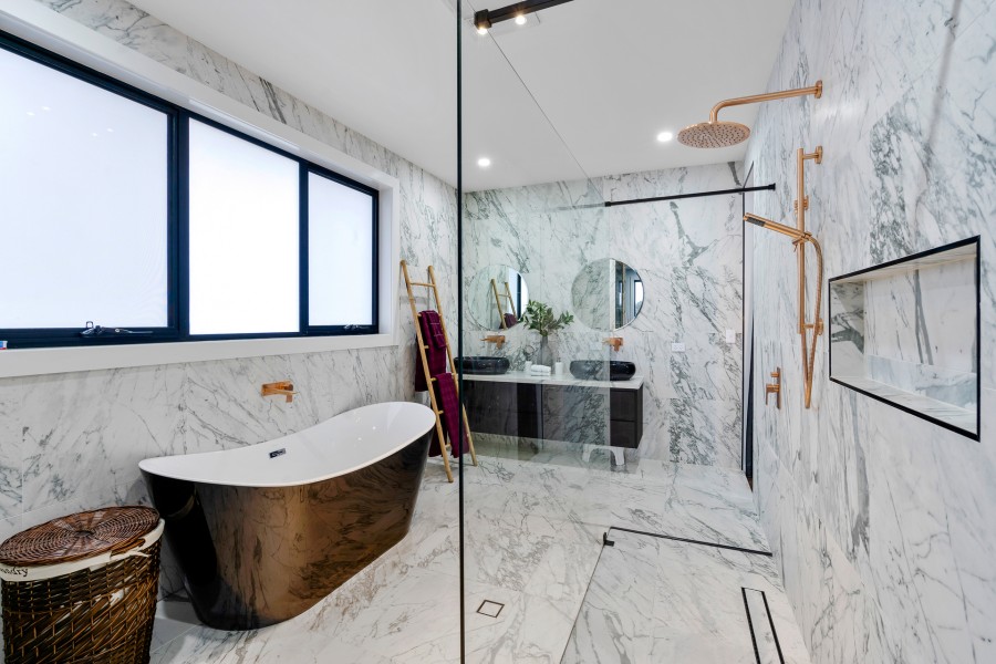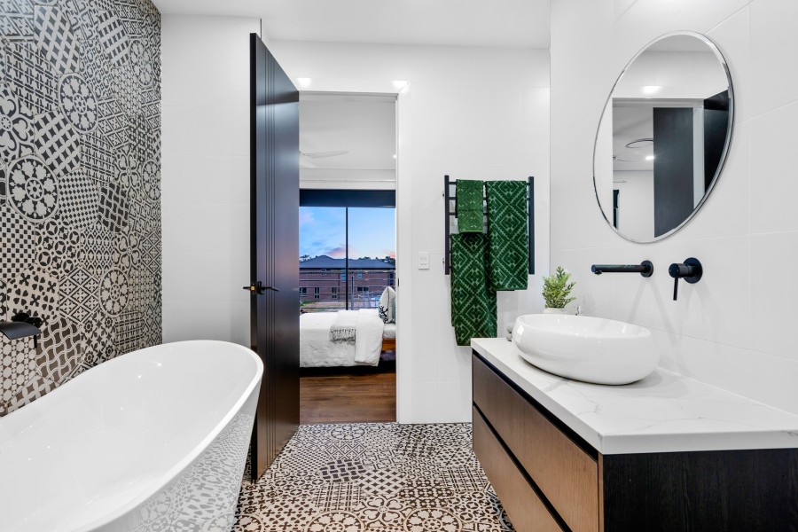 ~ Four immaculate modern bathrooms having in-wall cistern toilets, tiles top to the ceiling