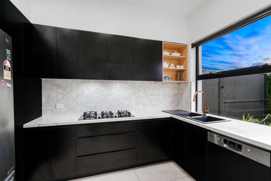 ~ Immaculate gourmet kitchen with smart caesar stone bench tops, Bosch appliances & Schweigen range hood