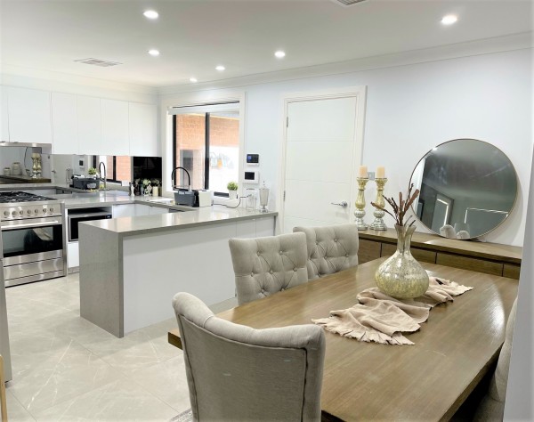 * Open plan design living with lounge flowing into dining space