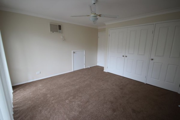 * Master bedroom with built ins, ceiling fan, balcony, storage and air conditioner