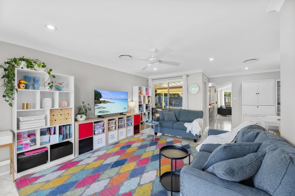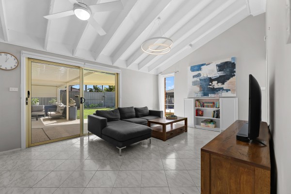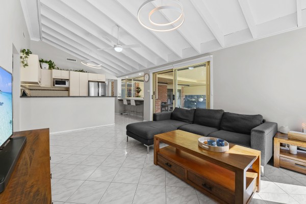 - Light filled family room off kitchen with raked ceilings, two infinity LED spiral pendents plus ceiling fans