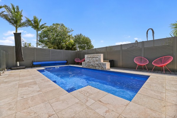 - In-ground fibreglass mineral water pool with water fountain and travertine outdoor tiles