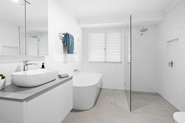 -Brand new ultra modern bathroom with tiles from floor to ceiling