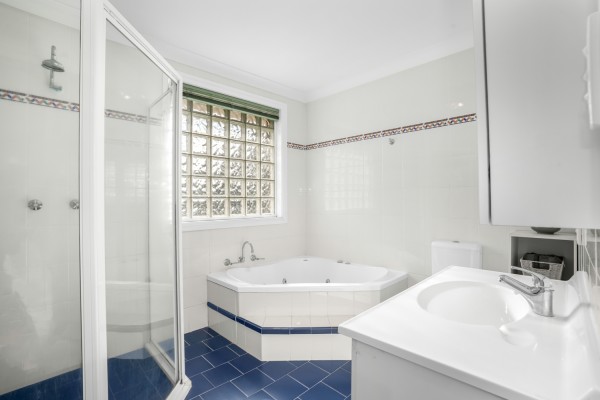 THE BATHROOM: Well presented main bathroom featuring floor to ceiling tiles and a corner spa bath.