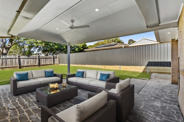 The large entertaining area is perfect for gatherings and celebrations, while the good-sized yard provides plenty of space for outdoor activities and play.