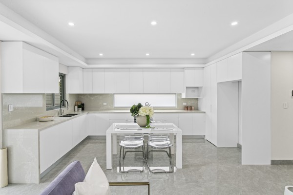 * Fresh open plan kitchen with stone bench tops