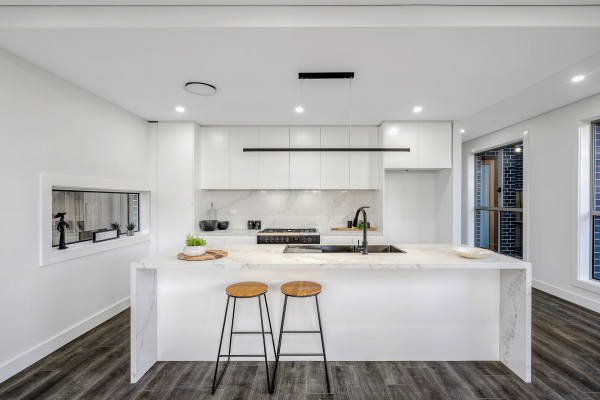 ~ Modern designer Kitchen with waterfall island, stone bench tops, quality appliances and plenty of storage.