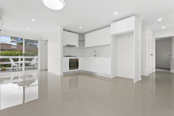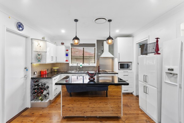 * Gas kitchen with thick stone bench tops