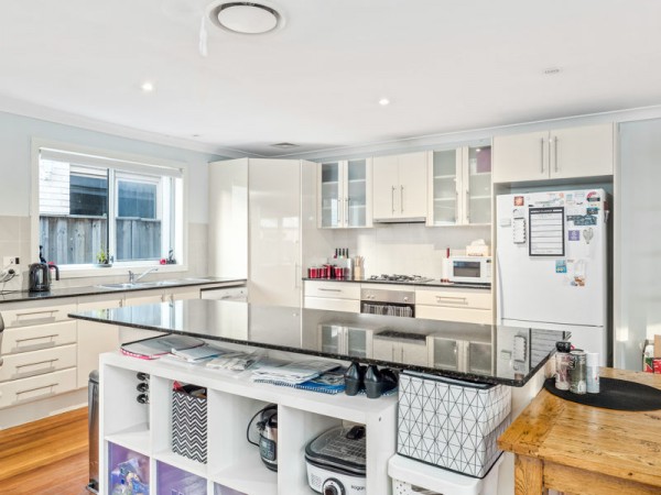 ~ Spacious kitchen with caesar-stone bench tops, gas stove cooking and breakfast bar