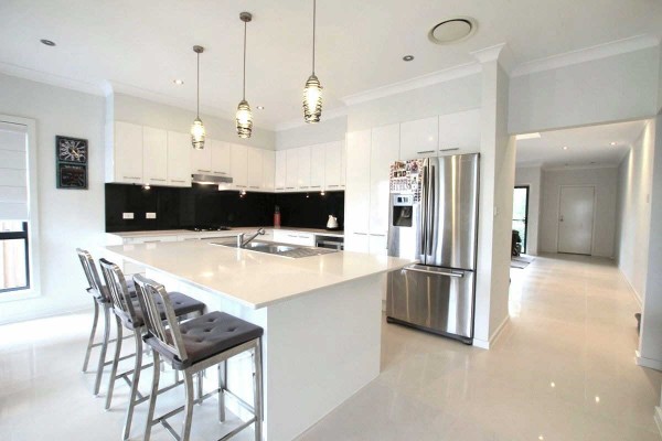 + Large gas kitchen with stone benchtops, glass splash backs, dishwasher and island bench