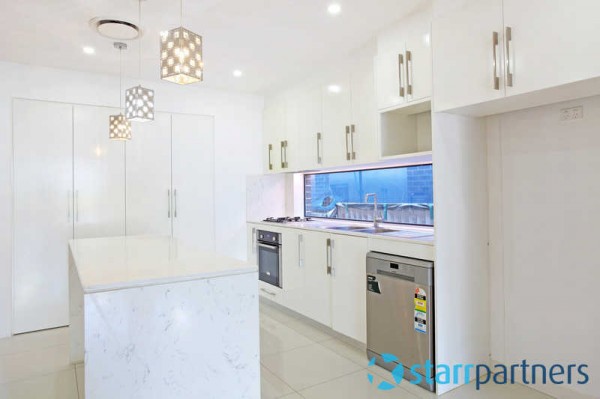 * Light-filled gas kitchen with Caesarstone benches and dishwasher