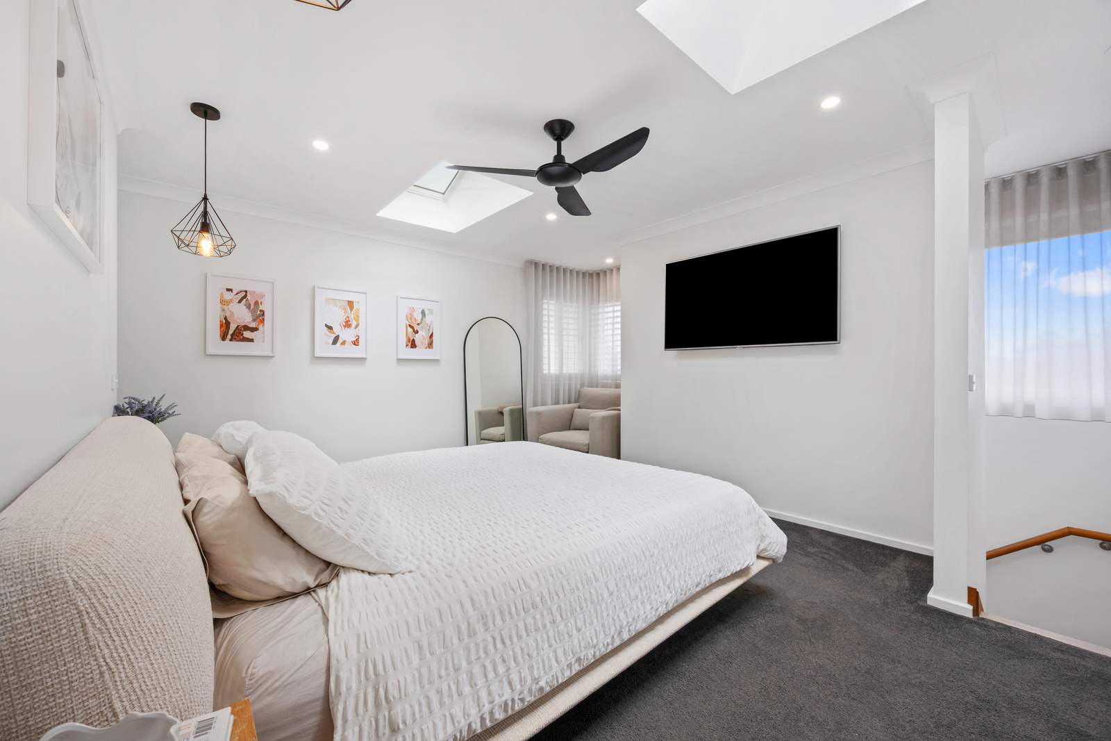 Taking the stairs up, a main bedroom like no other - a true retreat, with a huge main bedroom with walk in robe and 2 builtins, a bathroom with a touch of luxury, skylights, plenty of natural light to create the feeling of space and relaxation.