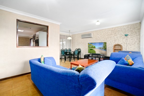 THE LIVING SPACE: Spacious L-shaped lounge and dining room at the front of the home offering a split system air conditioner. There is also an additional family room at the rear of the home.
