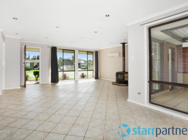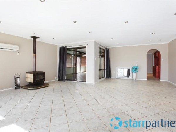 * Open plan lounge room with wood fire place, split system air