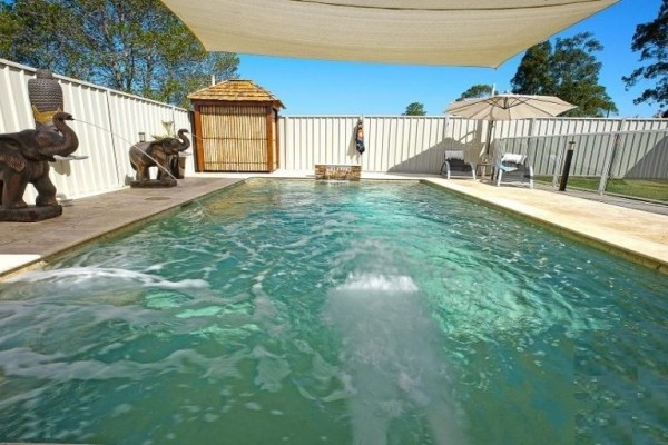 - Stunning saltwater in-ground pool features spa & solar heating.