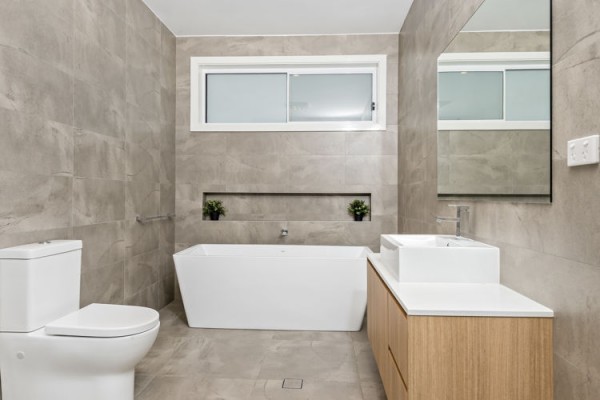 * Modern and spacious main bathroom with stand-alone bath