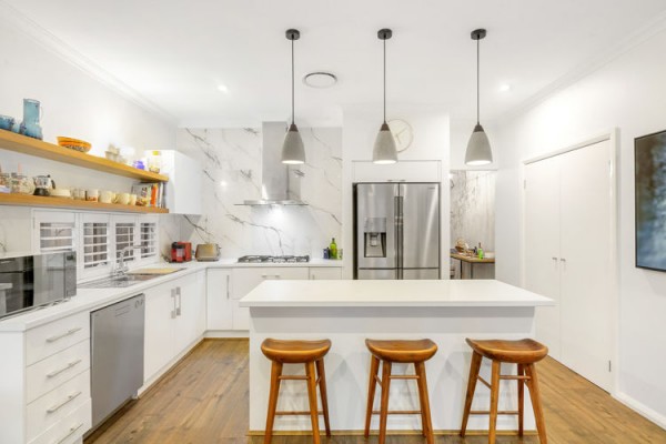 *Ultra modern kitchen with island bench, stainless steel appliances and pantry