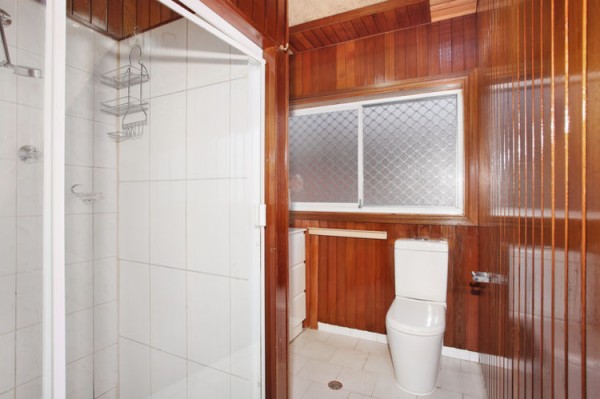 * Compact bathroom with no bath, timber lined walls & ceiling