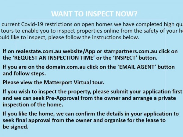 4. If you wish to inspect the property, please submit your application first and we can seek Pre-Approval from the owner and arrange a private inspection of the home.