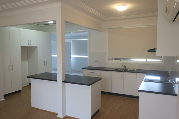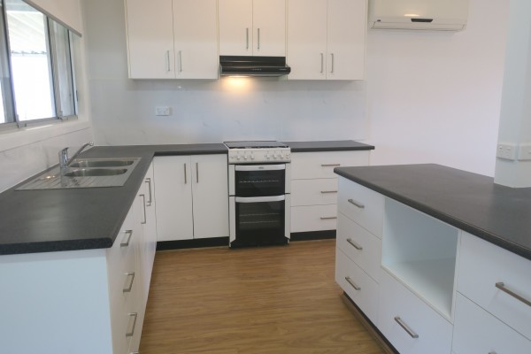 - Modern young kitchen with island benchtop, huge supply of cupboard space & gas cooking