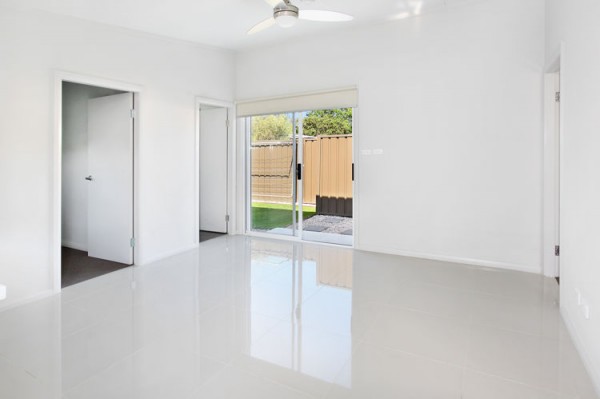 * Combined living area with tiled floors and ceiling fan