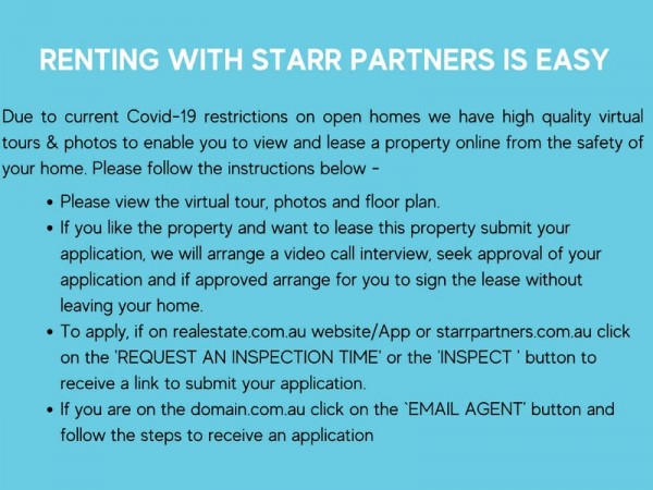 + We have high quality virtual tours, photos and floor plans to enable you to inspect & lease properties online. + View the Matterport Virtual tour, photos and floor plan. + Submit your application, seek approval of your application and if approved you can DocuSign your lease without leaving your home + If on realestate.com.au website/App or starrpartners.com.au click on the 'REQUEST AN INSPECTION TIME' or the 'INSPECT ' button to receive a link to submit your application. + If you are on the domain.com.au click on the `EMAIL AGENT' button and follow the steps.
