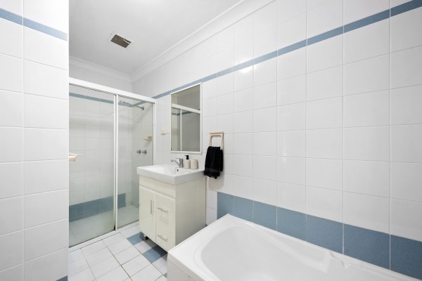 * Tidy bathroom with tiles throughout, separate tub & shower