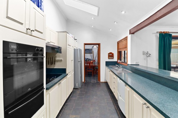 THE KITCHEN: Galley style kitchen featuring an electric cooktop and plenty of bench and cupboard space. There is also a skylight for ample natural lighting.