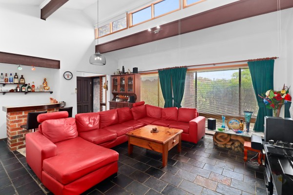 THE LIVING SPACE: Spacious L-shaped lounge and dining areas on entry, with a built-in bar and high ceilings. There is an additional family area off the kitchen, featuring a ceiling fan and fireplace, plus access out to the pergola area.