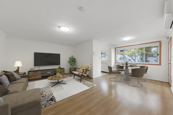 + Two generous bedrooms, main with built-in wardrobe + L-shaped lounge & dining room with split system air-conditioning