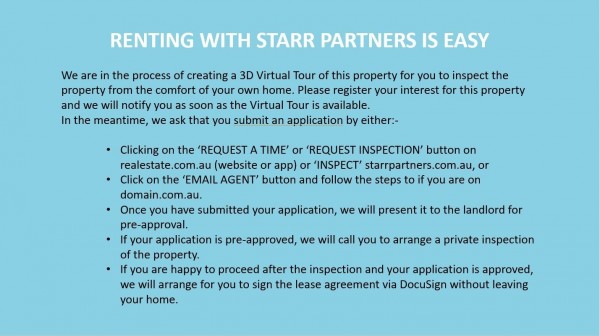 If you are interested in the property, submit your application. If you are on realestate.com.au (website or app) or starrpartners.com.au, click on ‘REQUEST A TIME, ‘REQUEST INSPECTION’ or ‘INSPECT’ button to receive a link. If you are on Domain.com.au click on the ‘EMAIL AGENT’ button and follow the steps to receive an application.