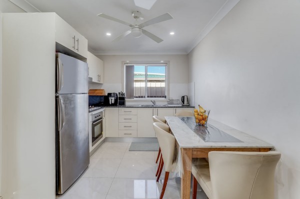 - Modern kitchen with stone benchtop and stainless steel appliances