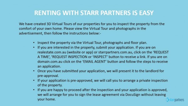 If you are interested in the property, submit your application. If you are on realestate.com.au (website or app) or starrpartners.com.au, click on ‘REQUEST A TIME, ‘REQUEST INSPECTION’ or ‘INSPECT’ button to receive a link. If you are on Domain.com.au click on the ‘EMAIL AGENT’ button and follow the steps to receive an application.
