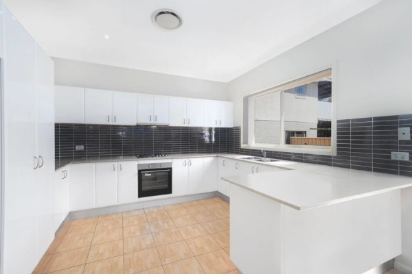 The kitchen is spacious and modern, with polyurethane cabinets, stone benchtops, and stainless steel appliances. The ground floor is tiled throughout, adding to the contemporary feel. There are three bathrooms in the home, all beautifully tiled to the ceiling.