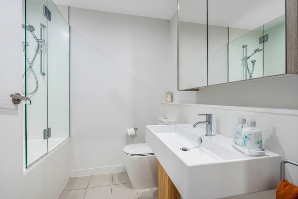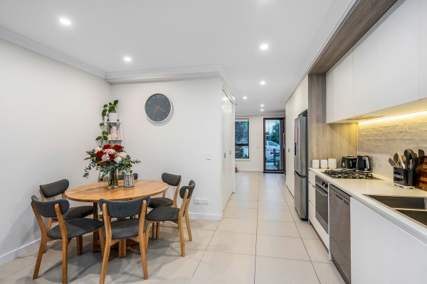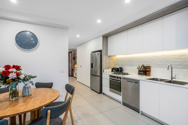 - Open plan kitchen with stone benchtop, soft-close drawers, gas cooktop, dishwasher & tiled splashback with stylish shadowline feature lighting