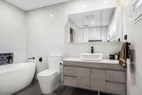 - Modern bathrooms, with Caesarstone wall hung vanities, & Second toilet in laundry