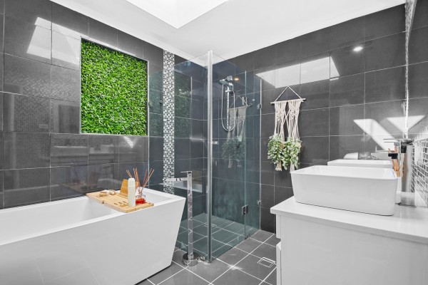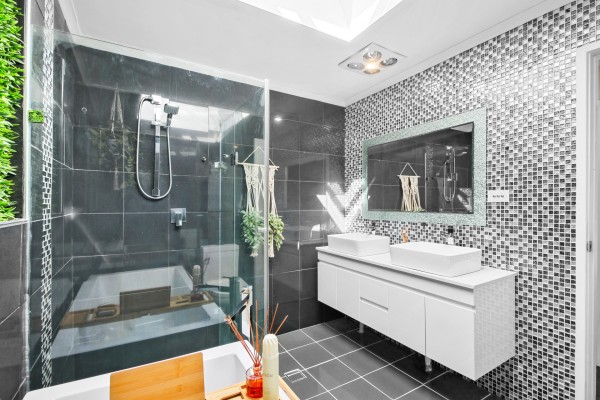 - Renovated bathroom with floating bathtub, his & hers basins, caesarstone vanity, mosaic tiled feature wall and floor to ceiling tiles with a large skylight