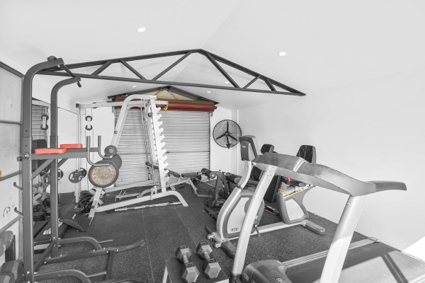 - Steps down to the concreted patio as well as grassed yard with glass sliding door access to single tandem garage converted to gym/work space with downlights