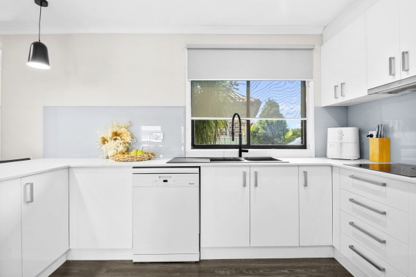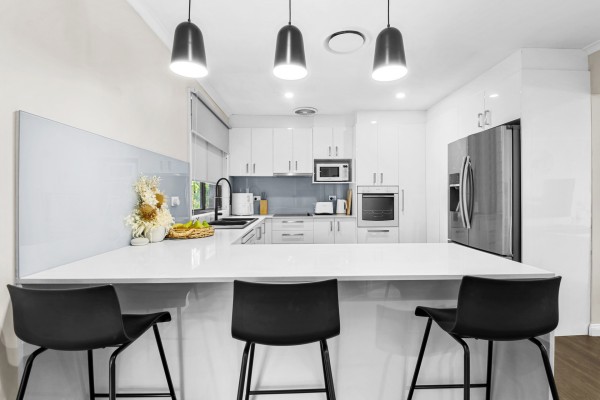- Renovated kitchen with caesarstone benchtops, westinghouse electric oven and cooktop, miele dishwasher, black double sink and a breakfast bar with feature lights