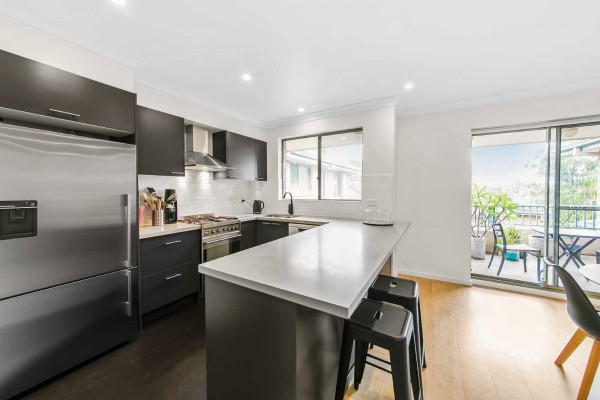 + Modern kitchen with stone bench tops, gas cooktop, dishwasher and plumbing for water to the fridge