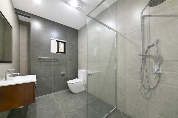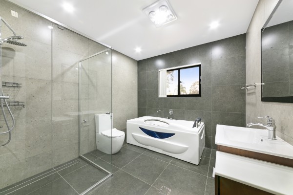 - Designer style main bathroom, fully tiled with a separate shower