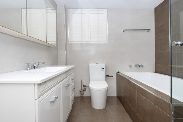 * Chic contemporary bathroom is appointed with stylish fittings