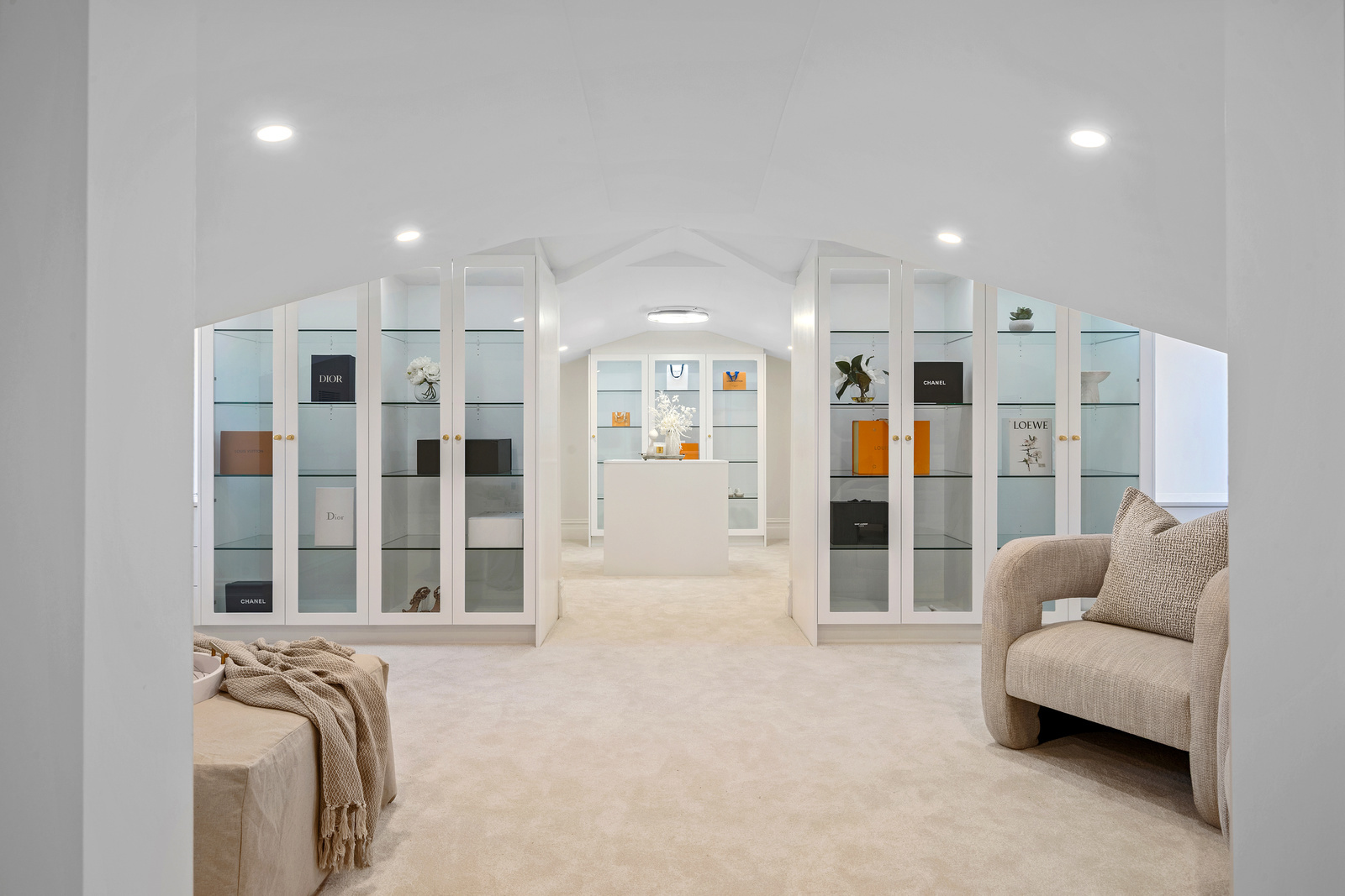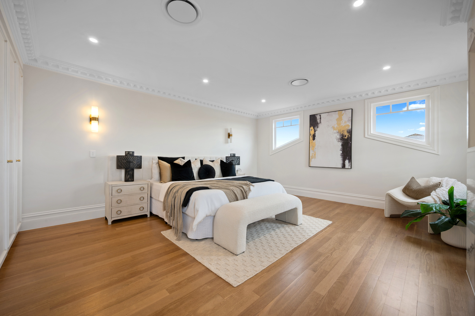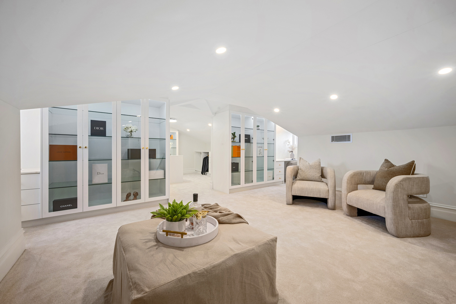 Taking the stairs up, a main suite like no other - huge main bedroom with built in wardrobes, private and high end bathroom, and then a separate parents space for fully fitted out to be used as a walk in wardrobe, dressing room, or a private retreat or home office space.