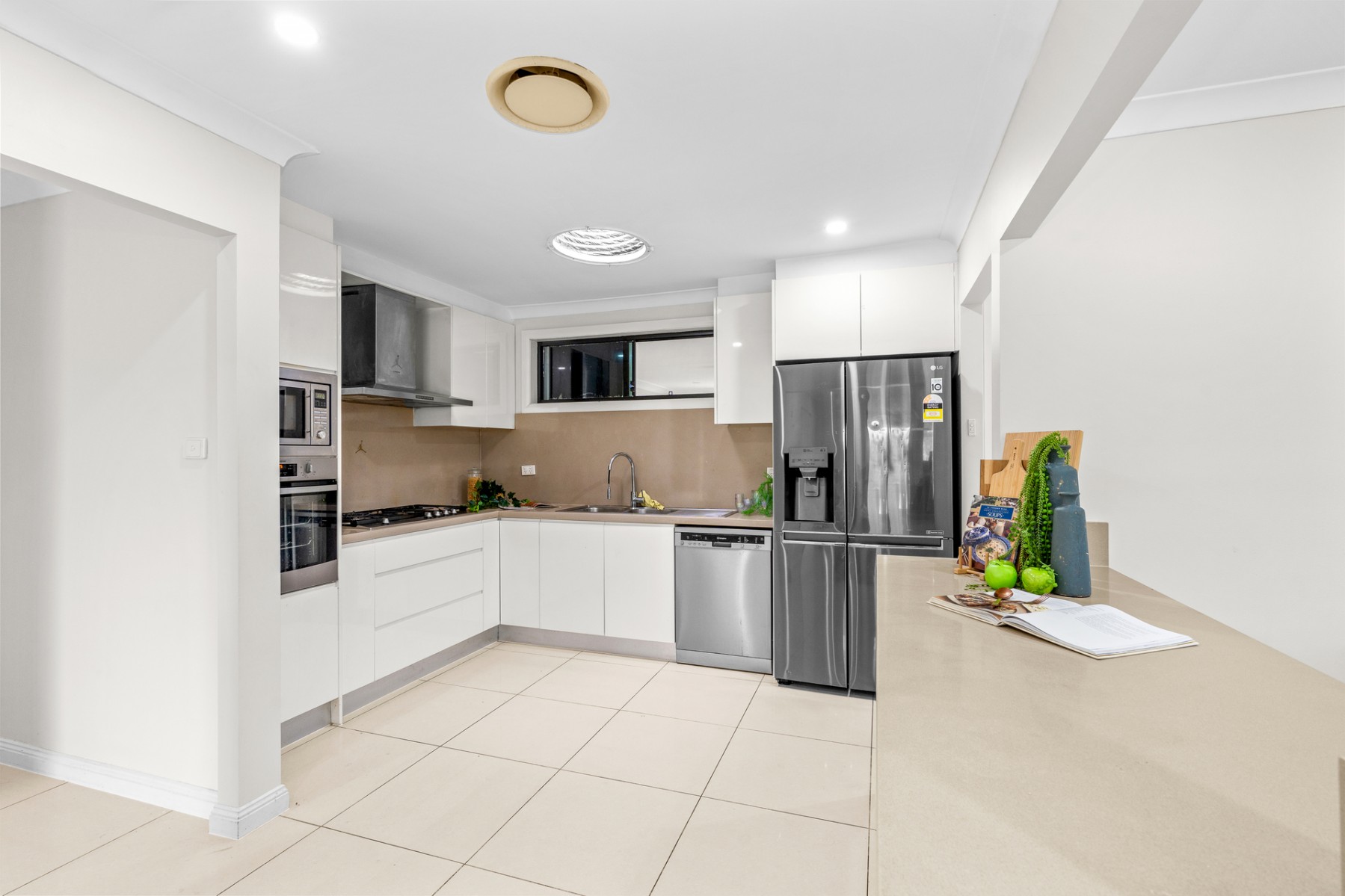 ~Gourmet kitchen with stone benchtops, gas cooktop, and quality appliances