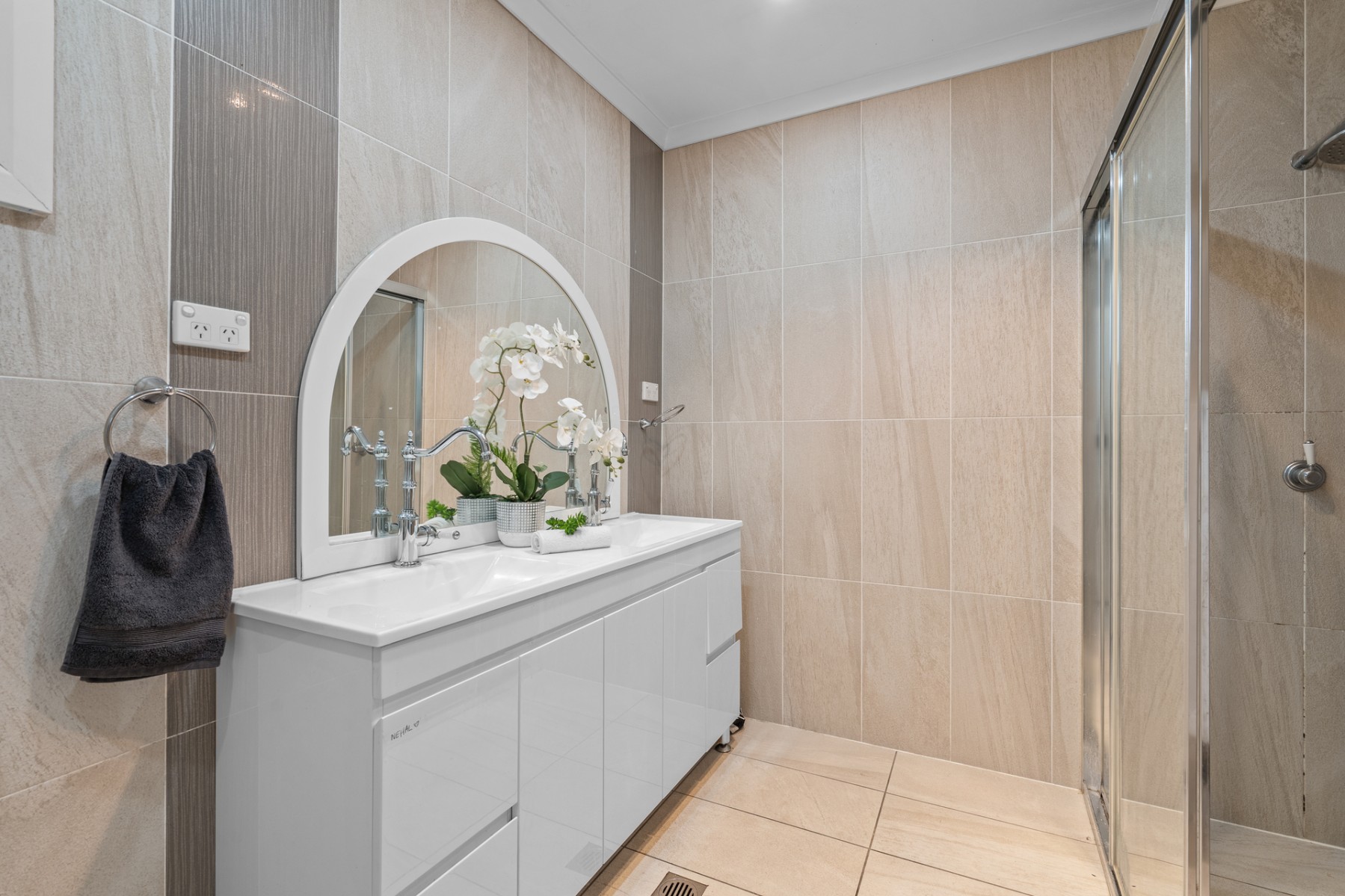~Main bathroom centrally positioned, featuring a dual-sink vanity and separate shower