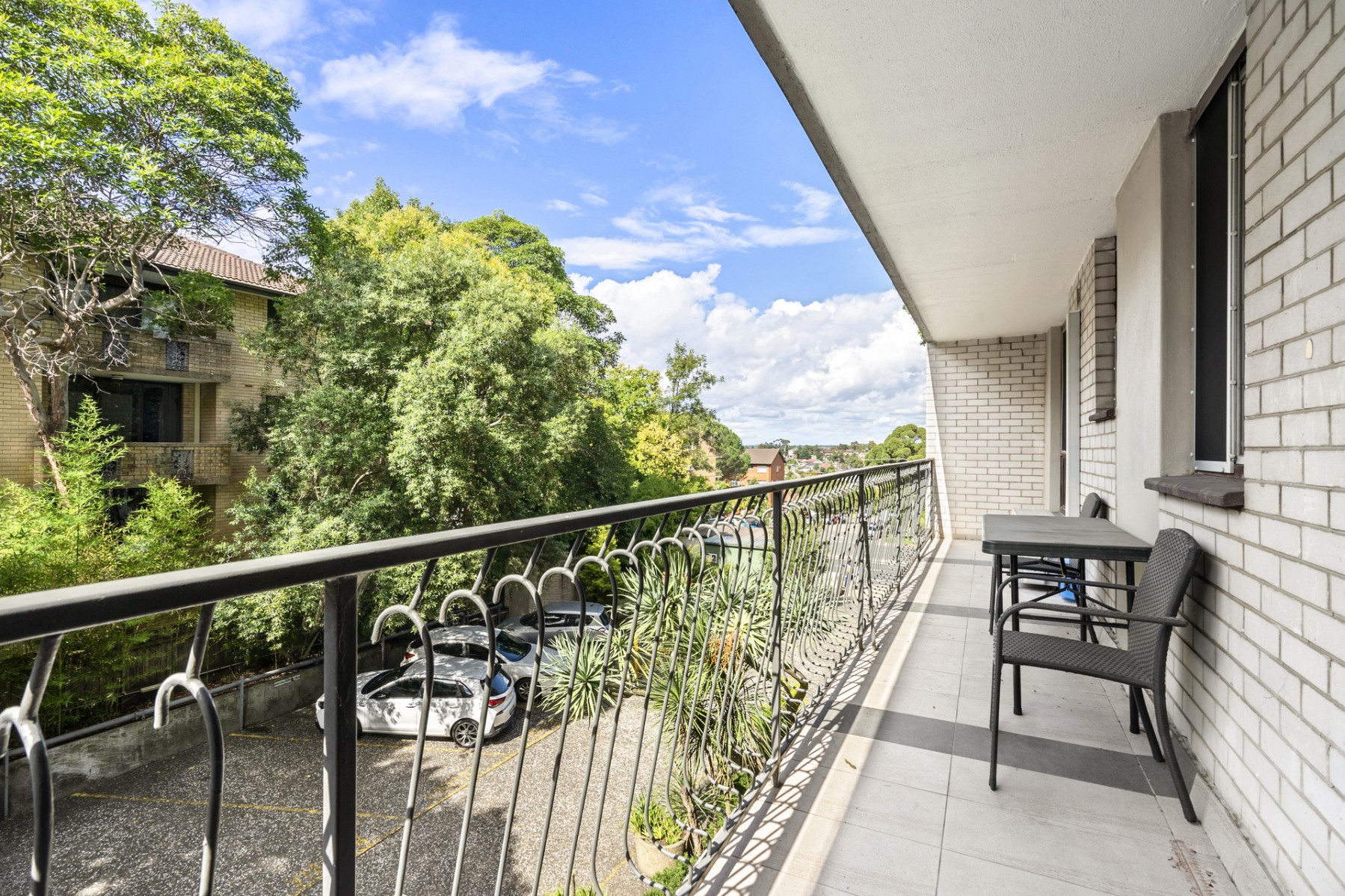 - Long tiled balcony with east aspect and leafy glimpses