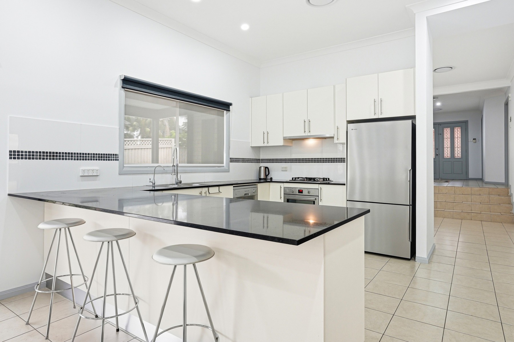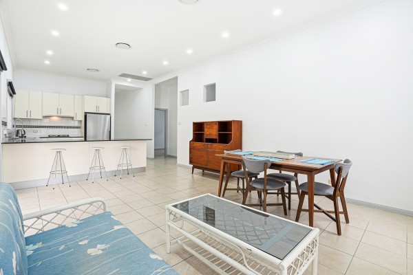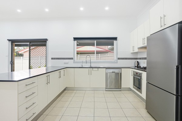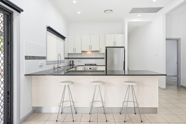 - Modern kitchen equipped with gas cooktop, dishwasher, double sink and breakfast bar, perfectly designed for both everyday meals and entertaining