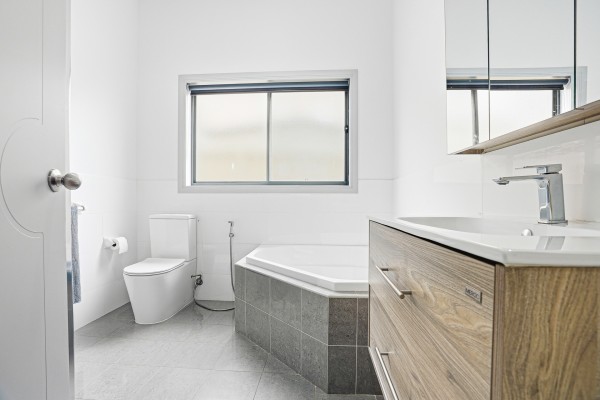 - Large modern main bathroom, beautifully tiled and complete with a relaxing corner bathtub