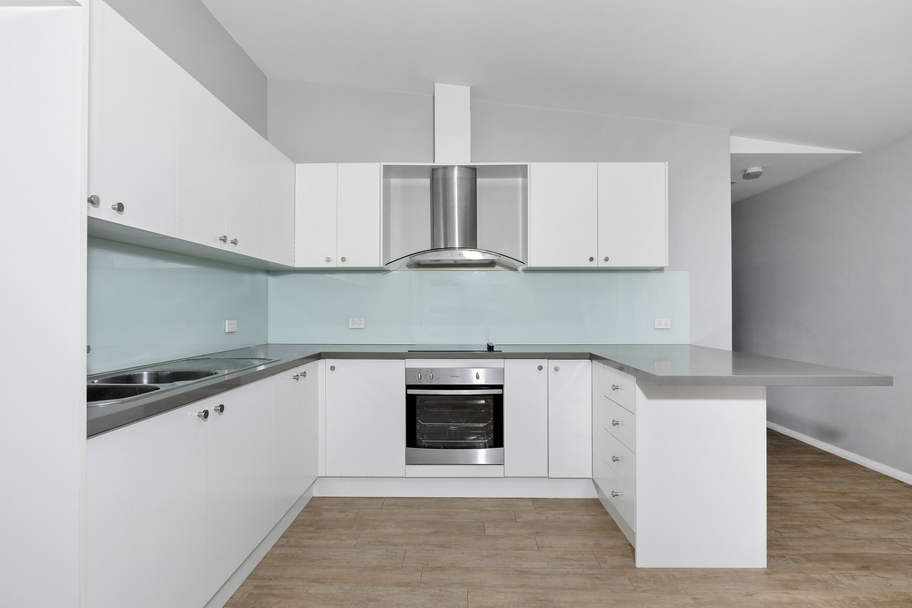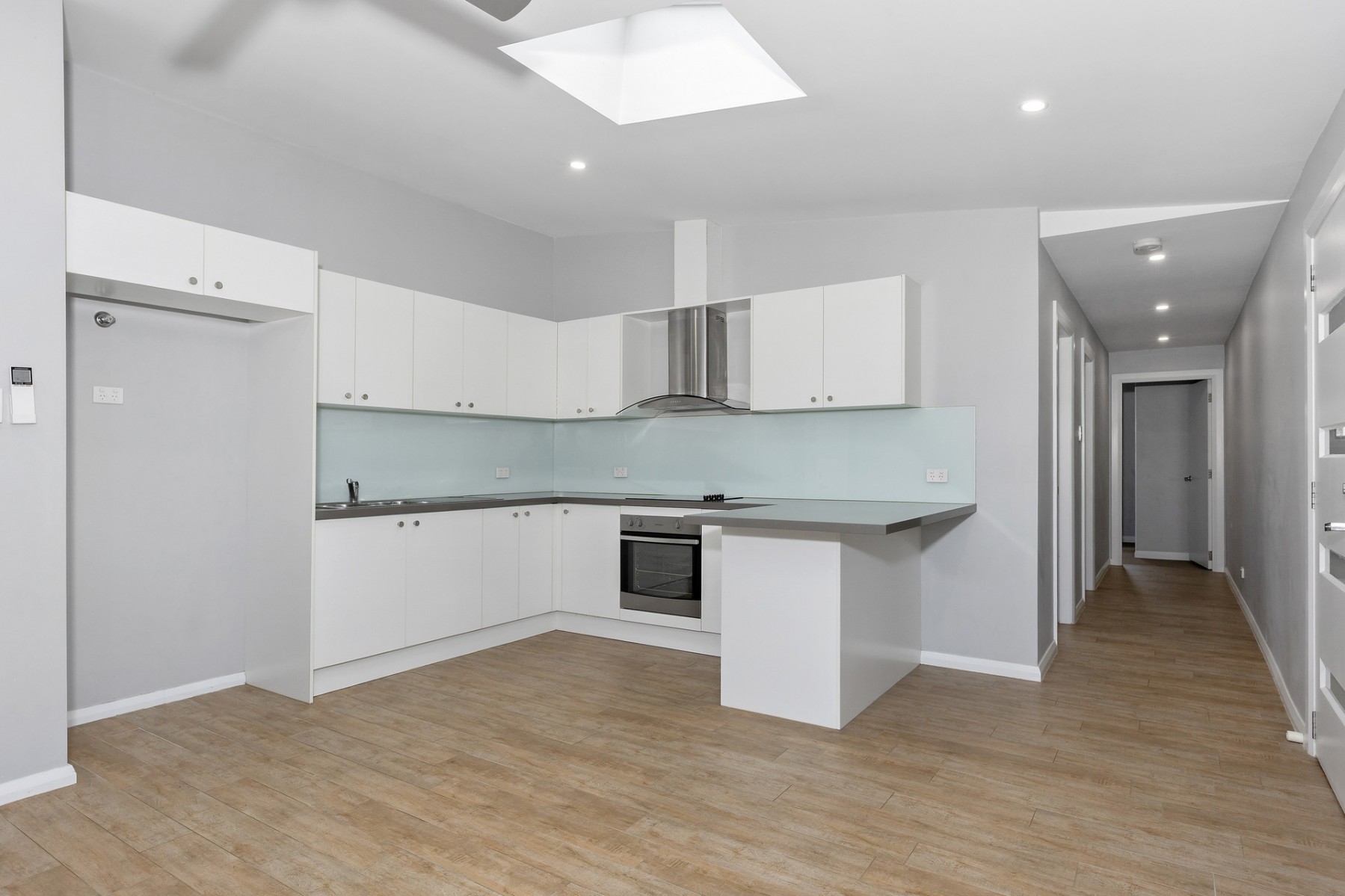 * Contemporary kitchen with glass stove top and skylight