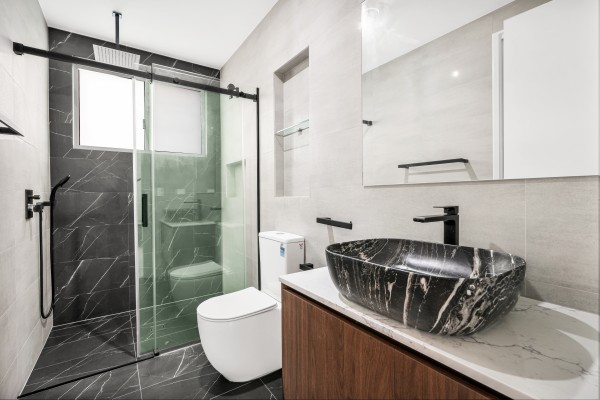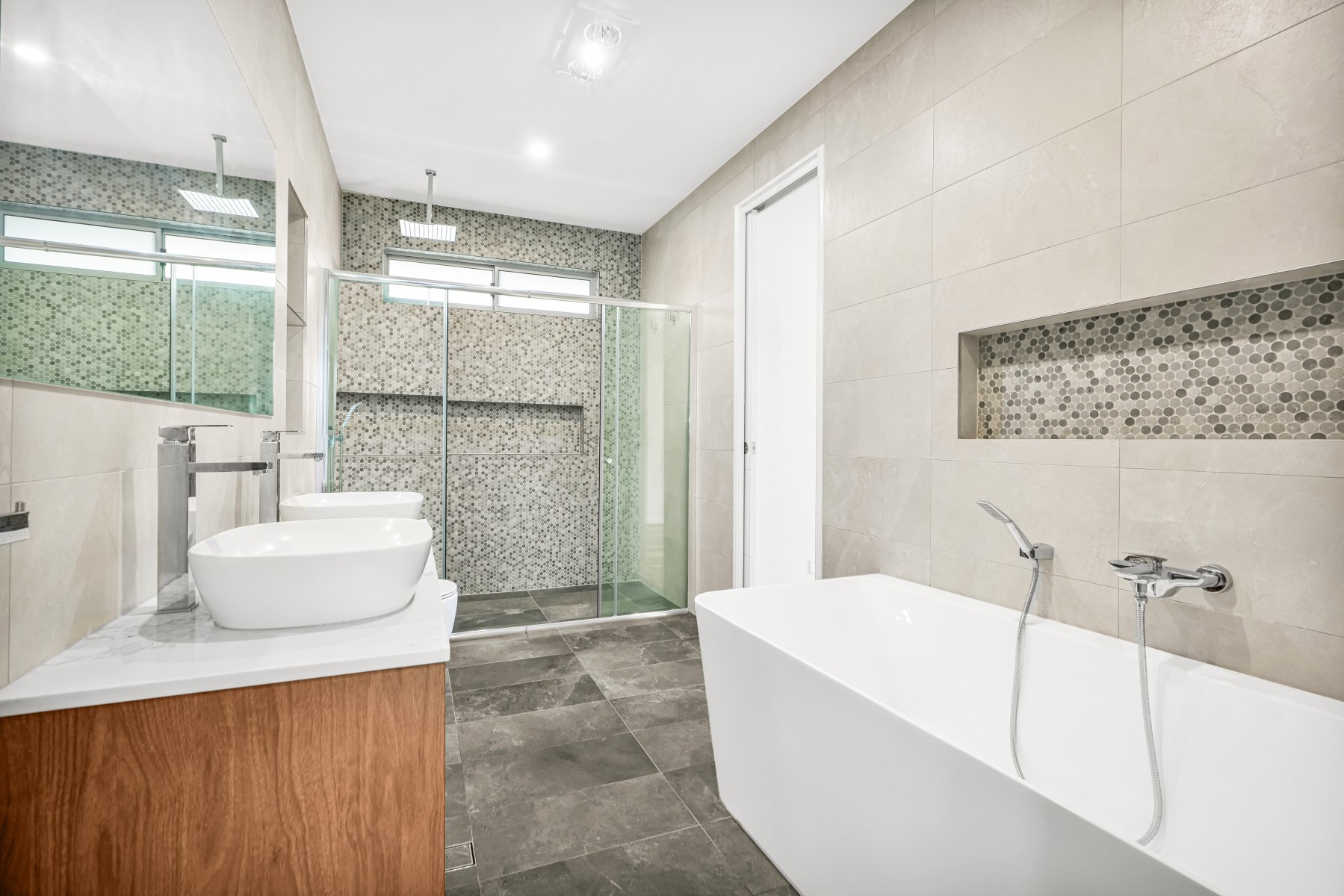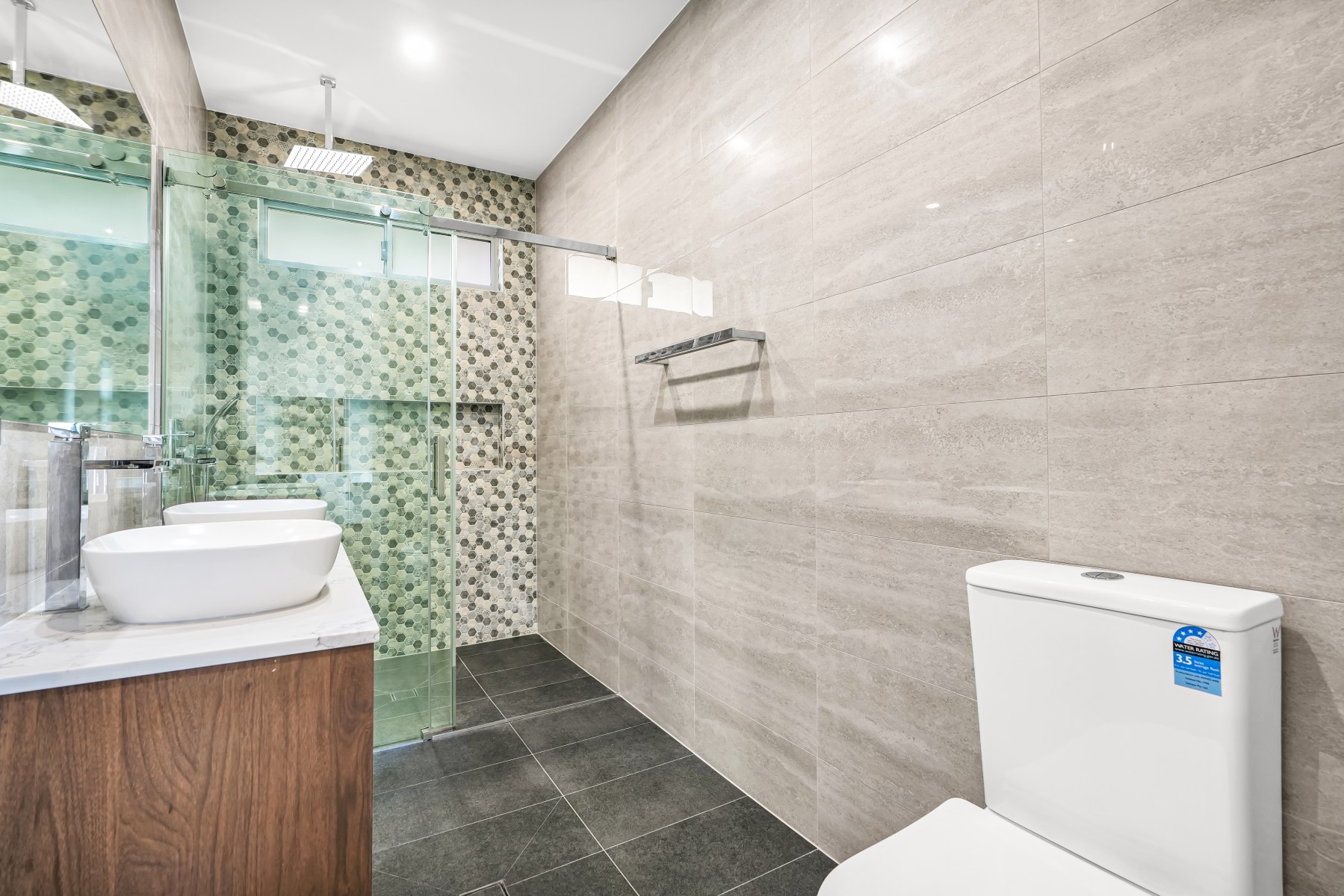 • Ultra-modern "Hamptons Inspired" main bathrooms with floor-to-ceiling tiles with wall-hung custom-made vanities & frame glass showers